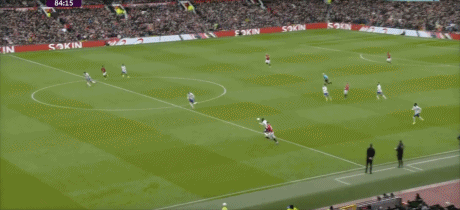 第43分钟,曼联反击,B费左路内切,禁区外右脚远射打偏。